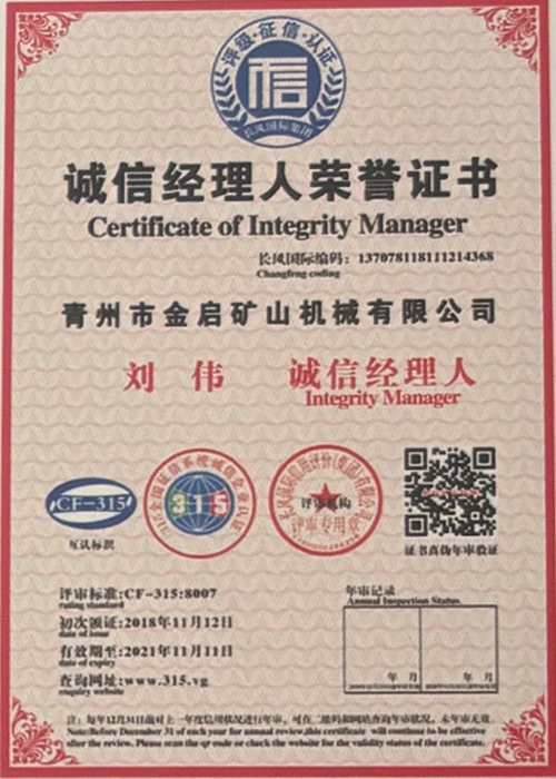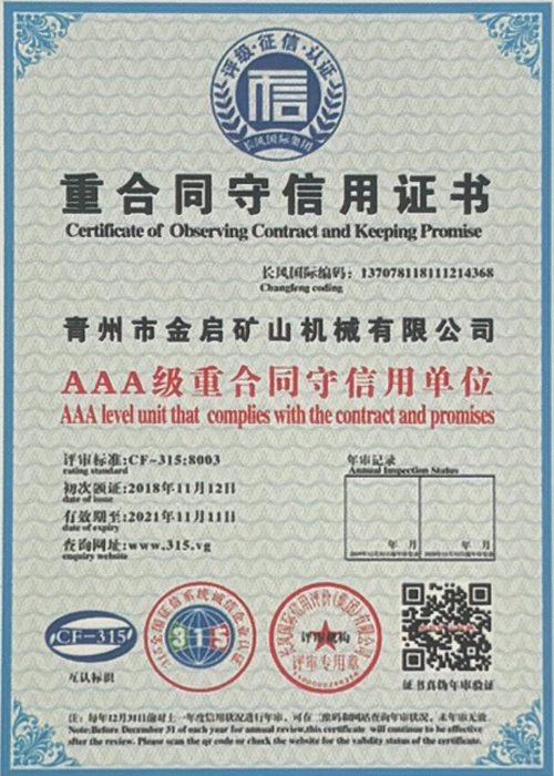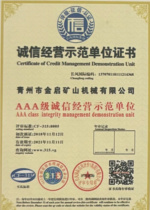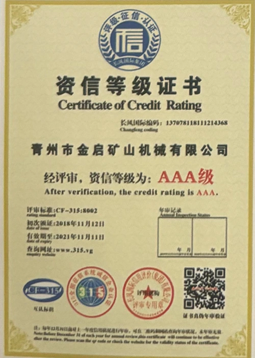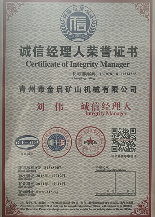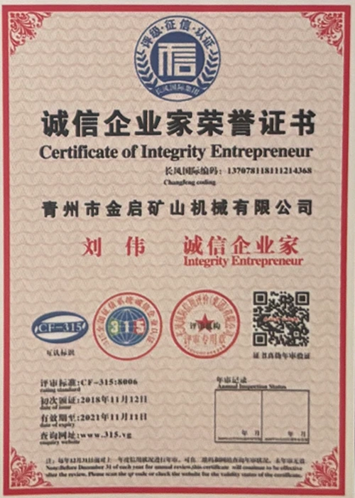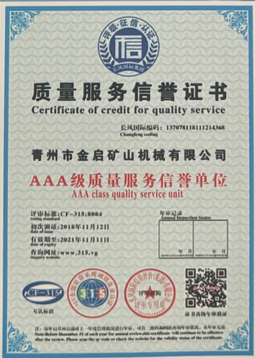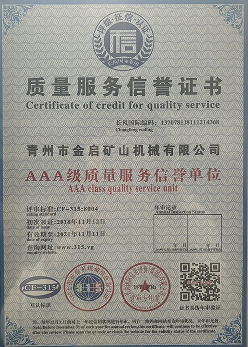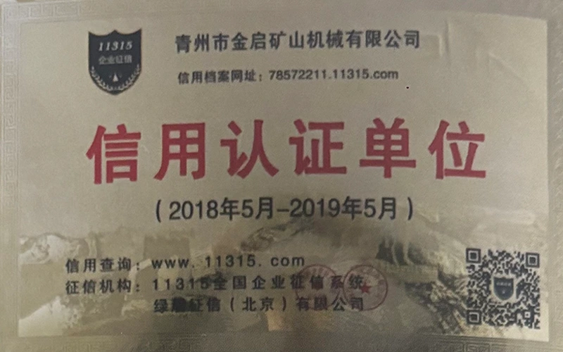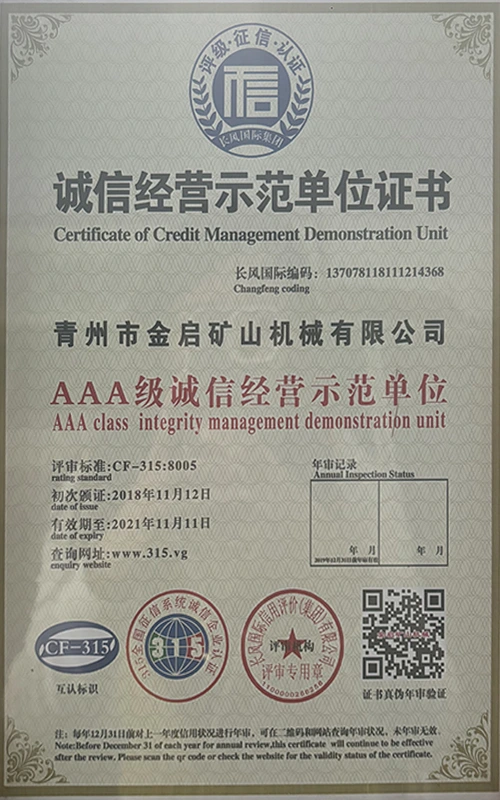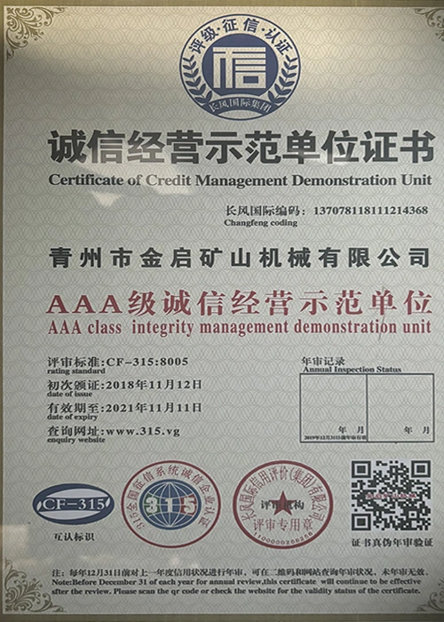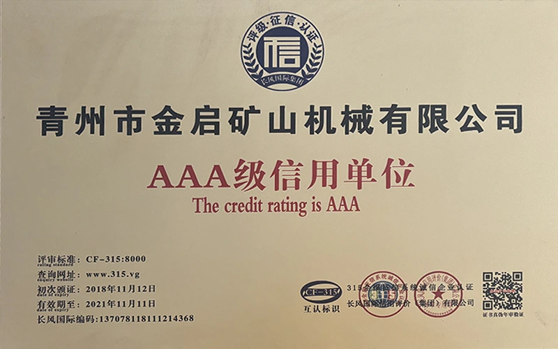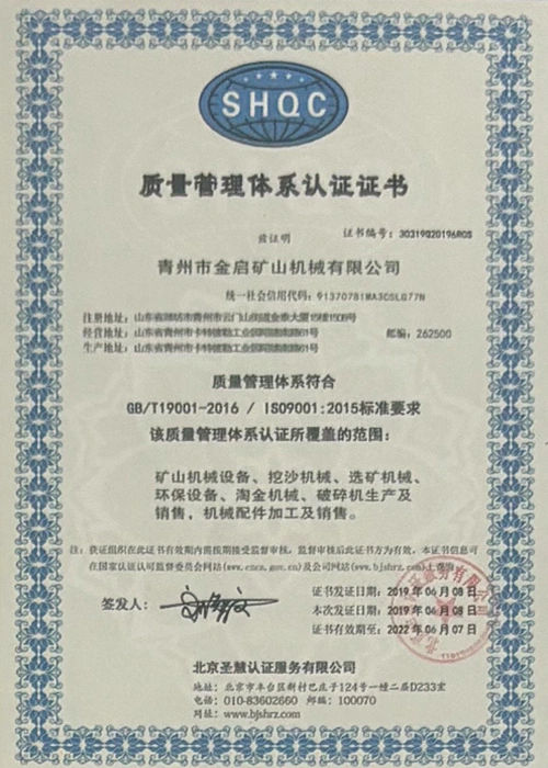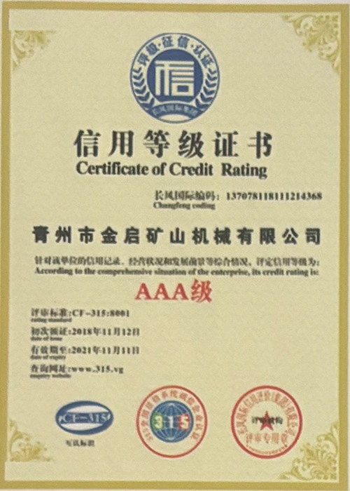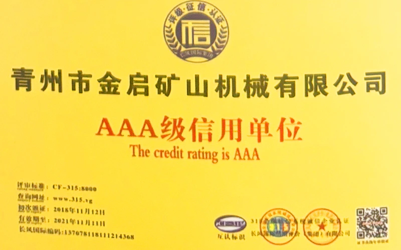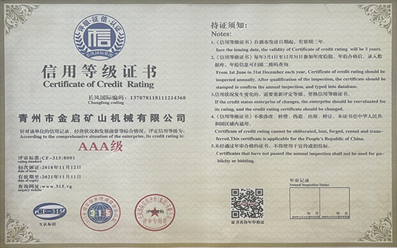Ngeminyaka yamava anzulu kushishino, kuxhomekeke kulawulo olungqongqo lomgangatho kunye nokutsha kobuchwepheshe obuqhubekayo, inkampani ifumene inani leziqinisekiso ezigunyazisiweyo, izatifikethi kunye nezatifikethi zelungelo elilodwa lomenzi wechiza, kubandakanywa nesiqinisekiso senkqubo yolawulo lomgangatho we-ISO, isatifikethi sokhuseleko lwemveliso yezimayini, kunye namalungelo awodwa abenzi bokuqanjwa kwezinto ezininzi kunye nemodeli esebenzayo yokumisela amalungelo awodwa abenzi bomgangatho wesixhobo kunye nokunyusa umgangatho wetekhnoloji. amandla obugcisa kunye nesiqinisekiso sokuvelisa esithobelayo.